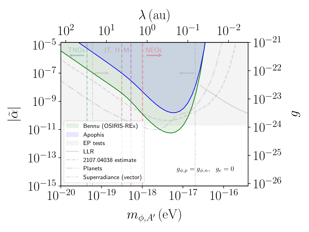Limiti su quinte forze mediate da nuove particelle ultraleggere scalari o vettori usando dati dalla missione OSIRIS-REx. Fonte: Tsai et al., Commun. Phys. 7 (2024) 311