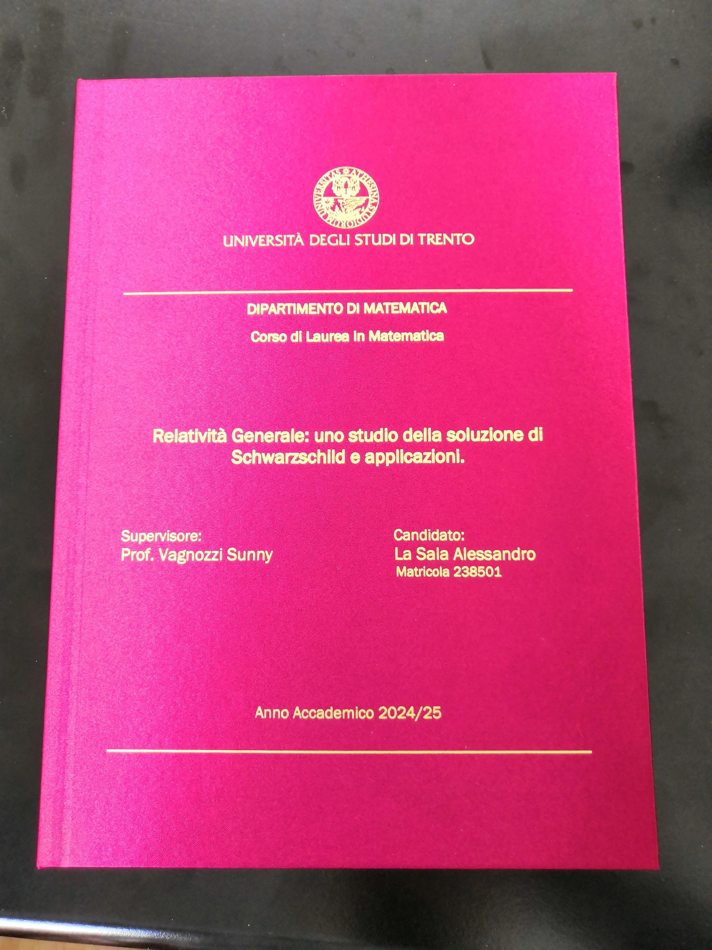 Congratulations to Alessandro La Sala, who today successfully defended his BSc thesis (for the BSc degree in Mathematics), by the title of “Relatività Generale: uno studio della soluzione di Schwarzschild e applicazioni”, which translates to “General Relativity: a study of the Schwarzschild solution and applications” (with the opponent being Prof. Sonia Mazzucchi)! In his thesis which I supervised, Alessandro discussed some basic aspects of General Relativity, before turning to features of the Schwarzschild solution.